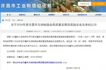 根据《许昌市人民政府关于印发许昌市支持制造业高质量发展奖励政策的通知》(许政〔2025〕14号)规定,许昌市组织了2024年度支持制造业高质量发展奖励企业的申报…